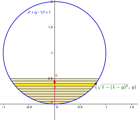 Supongamos que el líquido llega hasta una altura h. Calcularemos el área de ese sector circular como la suma de las cuerdas horizontales del circulo que van desde 0 hasta h. Veamos cuanto mide una de esas cuerdas en función de su altura que es el valor de la y.