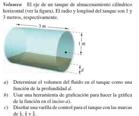 $$\begin{align}&x= \sqrt{1-(y-1)^2}\\&\text{Como la cuerda va de -x a x la longitud es}\\& l=2 \sqrt{1-(y-1)^2}\\&\text{y el área del sector será}\\&\\&A=\int_0^h 2 \sqrt{1-(y-1)^2}dy=\\&\\&y-1=sen\, t\\&dy = \cos t\;dt\\&y=0\implies sen \,t=-1\implies t = - \frac \pi 2\\&y=h \implies t=arcsen(h-1)\\&\\&2\int_{-\pi/2}^{arcsen(h-1)}\sqrt{1-sen^2t}·cost\;dt=\\&\\&2\int_{-\pi/2}^{arcsen(h-1)}\cos^2t \;dt=\\&\\&2\int_{-\pi/2}^{arcsen(h-1)}\frac{1+\cos 2t}{2}dt=\\&\\&\left[t+\frac{sen2t}{2}\right]_{-\pi/2}^{arcsen(h-1)}=\\&\\&\text{Mucho cuidado, el angulo doble de }-\frac \pi 2\\&\text{es el doble de }\frac{3\pi}{2}, o\; sea\; 3\pi=\pi\\&\\&arcsen(h-1)+sen(2arcsen(h-1))+ \frac \pi 2-0=\\&\\&\text{el seno del ángulo doble es}\\&sen\, 2\alpha = 2 sen\alpha·\cos \alpha\\&\\&=arcsen(h-1)+2sen(arcsen(h-1))·\cos(arcsen(h-1))+ \frac \pi 2=\\&\\&arcsen(h-1)+2(h-1) \sqrt{1-(h-1)^2}+\frac \pi 2\\&\\&\text{Esa es el área, luego el volumen}\\&\\&V=3\left(arcsen(h-1)+2(h-1) \sqrt{1-(h-1)^2}+\frac \pi 2 \right)\\&\\&\text{Podemos comprobar que para h=0}\\&V=3\left(arcsen(-1)-2 \sqrt 0+\frac \pi 2\right)=3\left(-\frac{\pi}{2}+\frac \pi 2 \right)=3·0=0\\&\\&\text{Para h=1 que es la mitad}\\&\\&V=3\left(arcsen(0)-2· 0 \sqrt 1+\frac \pi 2\right)=3\left(0+0+\frac \pi 2 \right)=\frac{3\pi}{2}\\&\\&\text{Para h=2 tanque completo}\\&\\&V=3\left(arcsen(1)-2· 1 \sqrt 0+\frac \pi 2\right)=3\left(\frac \pi 2+0+\frac \pi 2 \right)=3\pi\\&\end{align}$$