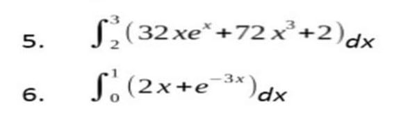$$\begin{align}&\text{la fórmula para integrar por partes es:}\\&\\&\int u\,dv = uv-\int v\,du\\&\\&\\&\int 32 xe^xdx =\\&\\&u= 32x\qquad du=32\,dx\\&dv=e^xdx\quad v=e^x\\&\\&=32xe^x-\int32e^x\,dx=\\&\\&32xe^x-32e^x =\\&\\&32e^x(x-1)\\&\\&\text{Y ahora vamos con toda la integral}\\&\\&5.\quad \int_2^3(32xe^x+72x^3+2)dx=\\&\\&\left[32e^x(x-1)+18x^4+2x \right]_2^3=\\&\\&64e^{3}+18·81+6-32e^2-18·16- 4=\\&\\&64e^3-32e^2+1458+6-288-4=\\&\\&64e^3-32e^2+1172\\&\\&-----------------\\&\\&6.\quad \int_0^1(2x+e^{-3x})dx=\\&\\&x^2\bigg|_0^1+\left( -\frac 13 \right)\int_0^1(-3)e^{-3x}dx\\&\\&1-0-\frac 13·e^{-3x}\bigg|_0^1=\\&\\&1-\frac 13(e^{-3}-e^0)=\\&\\&1-\frac{1}{3e^3}+\frac 13 = \quad \frac 43-\frac{1}{3e^3}\end{align}$$: