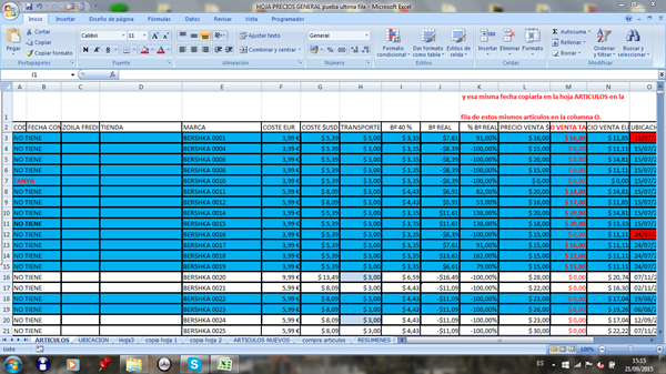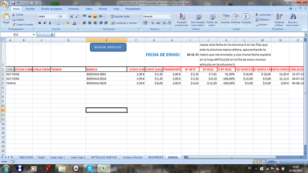 En la hoja ARTÍCULOS debo buscar en la columna MARCA, el contenido de una celda de la hoja ENVÍOS y copiar la fila entera