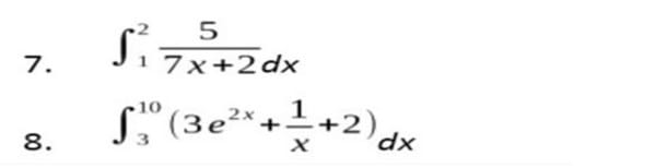 $$\begin{align}&\int_1^2 \frac{5}{7x+2}dx=\frac 57\int_1^2 \frac{7}{7x+2}dx=\\&\\&\frac 57 ln |7x+2|\bigg|_1^2=\frac 57(ln\,16-ln\,9)=\\&\\&\text{si acaso se pone así pero no le veo ganancia}\\&\\&=\frac 57ln\left(\frac{16}{9} \right)\\&\\&\end{align}$$La segunda también se resuelva ajustando alguna constante en la función exponencial primera.