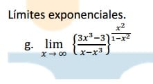 $$\begin{align}&\lim_{x \to \infty}(f^g)=\Bigg(\lim_{x \to \infty}f(x) \Bigg)^{ \lim_{x \to \infty} g(x)}\\&\\&\\&\lim_{x \to \infty}f(x)=\lim_{x \to \infty} \frac{3x^3-3}{x-x^3}=\lim_{x \to \infty}\frac{3x^3}{-x^3}=-3\\&\\&\lim_{x \to \infty} g(x)= \lim_{x \to \infty} \frac{x^2}{1-x^2}=\lim_{x \to \infty}\frac{x^2}{-x^2}=-1\\&\\&\Bigg(\lim_{x \to \infty} \frac{3x^3-3}{x-x^3} \Bigg)^{ \lim_{x \to \infty} \frac{x^2}{1-x^2}}=(-3)^{-1}=\frac{1}{-3}=-\frac{1}{3}\end{align}$$