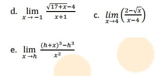 $$\begin{align}&(a+b)(a-b)=a^2-b^2\\&\\&d)\\&\lim_{x\to -1} \frac{\sqrt{17+x}-4}{x+1}=\frac{0}{0}=\lim_{x\to -1} \frac{\sqrt{17+x}-4}{x+1}· \frac{\sqrt{17+x}+4}{\sqrt{17+x}+4}=\\&\\&=\lim_{x\to -1} \frac{(\sqrt{17+x})^2-4^2}{(x+1) {(\sqrt{17+x}+4)}}=\lim_{x\to -1} \frac{17+x-16}{(x+1) {(\sqrt{17+x}+4)}}=\\&\\&\lim_{x\to -1} \frac{x+1}{(x+1) {(\sqrt{17+x}+4})}=\lim_{x\to -1} \frac{1}{\sqrt{17+x}+4}=\frac{1}{4+4}=\frac{1}{8}\\&\\&\end{align}$$Manda los otros en preguntas separadas