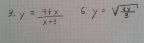 $$\begin{align}&y = \frac{9+x}{x+3}\\&\\&\text{Suponiendo }x\neq -3\text{ podemos dar este paso}\\&\\&(x+3)y = 9+x\\&\\&xy+3y = 9 +x\\&\\&xy-x = 9 -3y\\&\\&x(y-1)=9-3y\\&\\&x=\frac{9-3y}{y-1}\end{align}$$Y el rango de esta función es todo R salvo y=1, luego