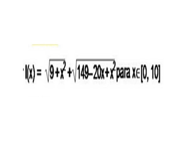 $$\begin{align}&f(x)=\sqrt{9+x^2}+ \sqrt{149-20x+x^2}\\&\\&f(x)'=\frac{1}{2 \sqrt{9+x^2}}·2x+\frac{1}{2 \sqrt{149-20x+x^2}}(-20+2x)=\\&\\&= \frac{x}{ \sqrt{9+x^2}}+\frac{-10+x}{ \sqrt{149-20x+x^2}}=0 \Longrightarrow\\&\\&\frac{x}{ \sqrt{9+x^2}}=\frac{10-x}{ \sqrt{149-20x+x^2}} \Longrightarrow\\&\\&x \sqrt{149-20x+x^2}=(10-x) \sqrt{9+x^2}\\&\\&Elevando \ al \ cuadrado:\\&\\&x^2(149-20x+x^2)=(10-x)^2(9+x^2)\\&\\&149x^2-20x^3+x^4=(100-20x+x^2)(9+x^2)\\&\\&149x^2-20x^3+x^4=900+100x^2-180x-20x^3+9x^2+x^4\\&\\&40x^2+180x-900=0\\&Simplificando:\\&2x^2+9x-45=0\\&Resolviendo\\&x_1=3 \ \ \epsilon[0,10]\\&x_2=-7.5\\&Comprobando \ mínimo \ en \ x=3\\&\\&Criterio \ de \ la \ derivada \ primera:\\&\\&f(2)'=\frac{2}{\sqrt{9+4}}+\frac{-8}{\sqrt{149-40+4}}=\frac{2}{\sqrt {13}}-\frac{8}{\sqrt{113}}=-0.197<0 \Rightarrow decreciente\\&\\&f(4)'=\frac{4}{\sqrt{9+16}}+\frac{-6}{\sqrt{149-80+16}}=\frac{4}{5}-\frac{6}{\sqrt{85}}=0.14>0 \Rightarrow creciente\\&\\&\Longrightarrow \ x=3 \ es \ un \ mínimo\\&\\&\\&\\&\end{align}$$Saludos