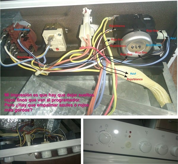 Yo creo que para puentear el programador o reloj del horno Teka HT-510 ME, hay que soltar dos cables ROJOS FINOS que van a éste. Pero tengo mis dudas y tampoco sé si hay que empalmar otros cables que están ahí también, algo más gordos y son azules y rojos. Todo está muy bien explicado en las imágenes que adjunto con explicaciones y flechas.