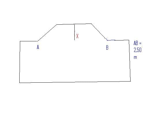 La pregunta dice lo siguiente: El croquis muestra una habitación con una ventana saliente en forma de medio hexágono.La distancia "AB" es = 2,50 m.Cálcular la distancia "x".