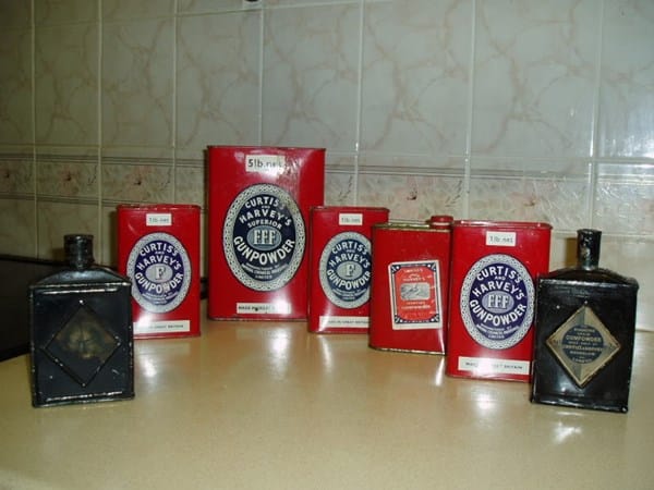 Tengo una botellita metálica de pólvora antigua para recargar y solo la he visto la foto en un foro de estados unidos de una empresa que se cerro hace más de 50 años, si alguien me puede decir lo que vale se lo agradecería. La que tengo yo es la negra de la derecha y esta en muy buen estado.