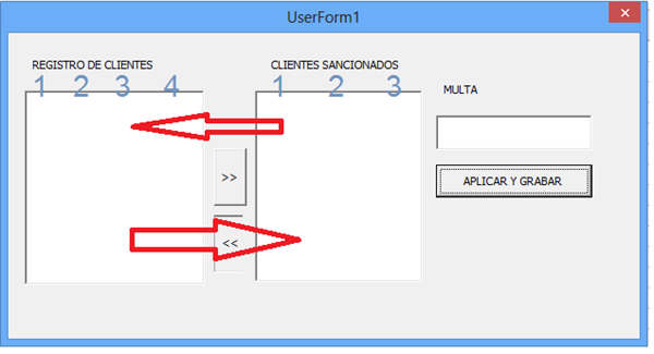 Y otro button2 "<<" me permitirá eliminar registros del LISTBOX2 en caso que me equivoque.