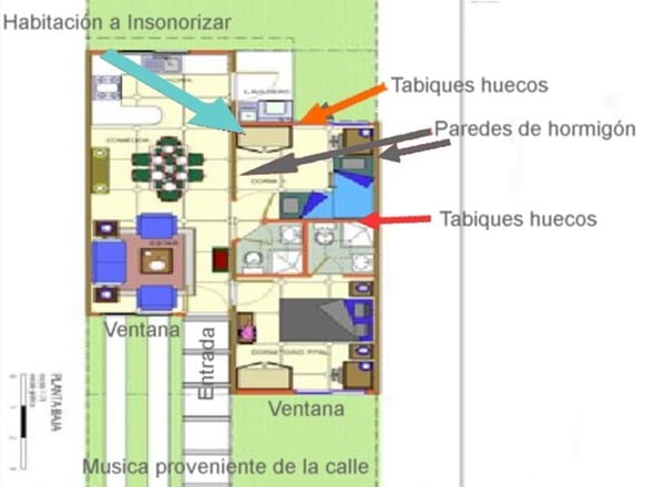 Quisiera que me enviases un plano de tu casa señalando en él cual es la habitación que quieres aislar, donde está la calle, cual o cuales son las paredes que dices son de concreto y cuales de tabique, qué tienes encima y debajo, y a qué altura estás de la calle. Tambien si la calle es ancha o estrecha.