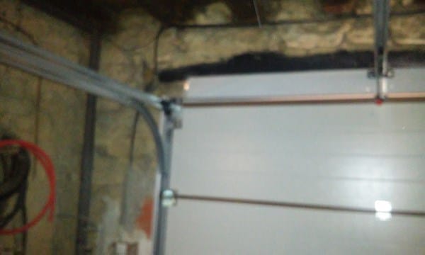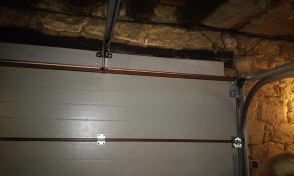 Estas puertas, para funcionar, necesitan un espacio por encima, para los muelles que soportan el peso de la misma, y para la motorización. Este espacio, varía en función de la posición de los muelles (delante o atrás), y del tipo de motorización (de techo, lateral), así como de las curvas de las guías por donde corre la puerta (sencilla oo como en tu caso, doble). Así, por ejemplo, puedes trabajar con este espacio (que se llama dintel) desde 15 cms hasta la medida que quieras.
