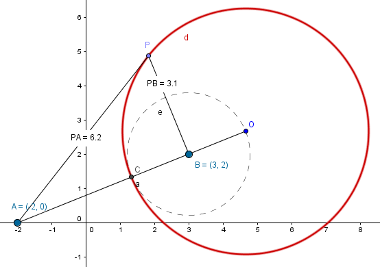 Hallar la ecuación del lugar geométrico de los puntos P(x, y) cuya distancia a A(-2,0) se a el doble de la de B(3,2) 3x2+3y2-28x-16y+48=0