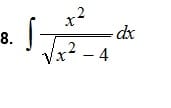 $$\begin{align}&\int \frac{x^2}{\sqrt{x^2-4}}dx=\\&\\&x=2ch\;t\qquad\text{(ch es cosh super abreviado)}\\&\\&dx=2sh\,t\,dt\quad\text{(y sh es senh}\\&\\&\int \frac{4ch^2t}{\sqrt{4ch^2t-4}}·2sh\,tdt=\\&\\&8\int \frac{ch^2t·sh\,t}{2 \sqrt{ch^2t-1}}dt=\\&\\&4\int \frac{ch^2t·sh\,t}{sh\,t}dt=\\&\\&4\int ch^2t\;dt=\\&\\&4\int\left(\frac 12+\frac{ch\,2t}{2} \right)dt=\\&\\&2t+sh \,2t+C=\\&2t + 2sht·cht+C=\\&\\&\text{tenemos que }t=argch \frac x2\\&\\&2argch \frac x2+2sh\left(argch \frac x2\right)·\frac x2+C=\\&\\&2argch \frac x2+2sh\left(argsh \sqrt{\frac{x^2}{4}+1} \right)·\frac x2+C=\\&\\&2argch \frac x2+x \sqrt{\frac{x^2}{4}+1}+C=\\&\\&2 argch \frac x2+\frac x2 \sqrt{x^2+4}+C=\\&\\&\text{y de acuaerdo con la filosofía del cambio se tendría}\\&\text{que dejar así, pero se puede cambiar sabiendo que}\\&argch\,x = ln(x+ \sqrt{x^2-1})\\&\\&= 2ln\left(\frac x2+\sqrt{ \frac{x^2}{4}-1} \right)+\frac x2 \sqrt{x^2+4}+C=\\&\\&2ln\left(\frac {x+\sqrt{x^2-4}}{2} \right)+\frac x2 \sqrt{x^2+4}+C=\\&\\&2ln\left(x+\sqrt{x^2-4} \right)-2ln2+\frac x2 \sqrt{x^2+4}+C=\\&\\&\text{pero 2ln2 es una constante, la C se la engulle}\\&\\&2ln\left(x+\sqrt{x^2-4} \right)+\frac x2 \sqrt{x^2+4}+C\end{align}$$: