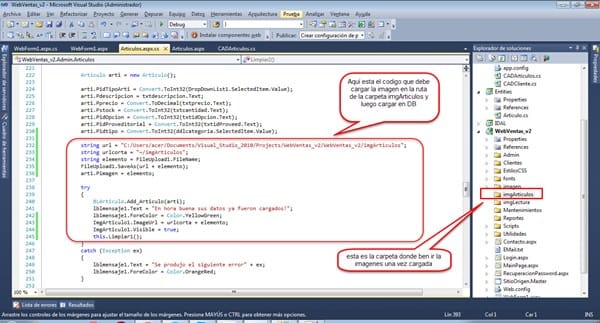 Estuve tratando de cargar una imagen utilizando un control Fileupload en Asp.Net, la idea principal es que la imagen se cargue en una carpeta llamada imgArticulo de mi proyecto en la misma se deben cargar todas las imágenes de artículos y luego la descripción de la ruta debe cargarse en mi Base de datos de SQLServer, resulta que el código que he utilizado antes funcionaba ahora no carga nada este es el código fuente que está dentro de un botón cargarArticulo