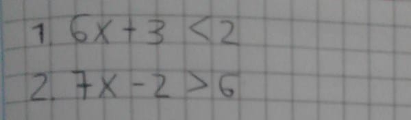 $$\begin{align}&1)\\&\\&6x+3\lt2\\&\\&6x \lt2-3\\&\\&6x \lt -1\\&\\&x\lt-\frac 16\\&\\&\text{como -1/6 no entra el intervalo es abierto}\\&\\&x\in \left(-\infty,-\frac 16 \right)\\&\\&\\&\\&2)\\&\\&7x-2\gt 6\\&\\&7x \gt 6+2\\&\\&7x\gt 8\\&\\&x\gt \frac 87\\&\\&x\in \left(-\infty,\frac 87 \right)\end{align}$$: