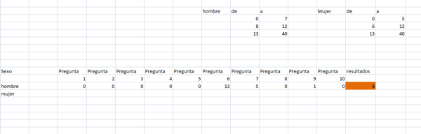 Mi intención es que si en la columna A (que es el sexo) pone "hombre" los valores de la pregunta 1 a la 10 se sumen y si el resultado da de 0 a 7 la celda del resultado se ponga de color verde, si es de 8 a 12 que se rellene de naranja y si es de 13 a 40 que se rellene de rojo.