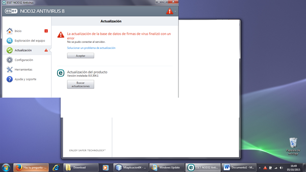 Tengo el Norton ESSET Nod32 Antivirus le repente cuando yo quiero actualizar la base de datos de firmas de mi antivirus por que me sale un icono de advertencia entonces me sale la base de datos del antivirus esta desactualizado y al hacer click en Actualizar me sale este mensaje la actualizacion de la base de datos de firmas de virus finalizo con un error y tambien me abajito otro de dice No se pudo conectar al servidor bueno la imagen lo muestra