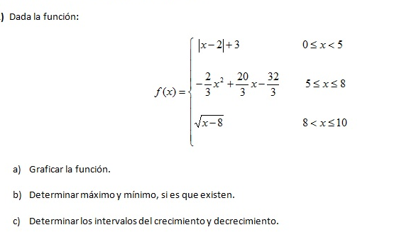 Su ayuda para poder resolver la siguiente función y así sacar el intervalo, determinar el máximo y mínimo, ello debido a que no he logrado sacarlo.
