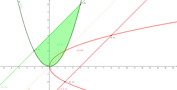 Observa también que si quisieras calcular el área con las funciones iniciales (rojas) tendrías que despejar la y=sqrt(2x) y=-sqrt(2x)