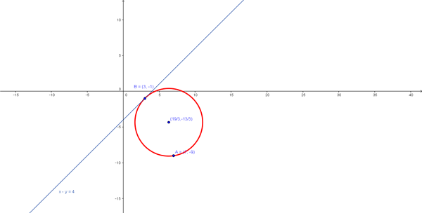 $$\begin{align}&\vec{CB}=B-C=(3,-1)-(a,b)=(3-a,-1-b)\\&\\&\vec{d}=(-1,1)\\&\\&\vec{CB}·\vec{d}=0\\&(3-a,-1-b)·(1,1)=0\\&3-a-1-b=0\\&2=a+b\\&\\&Resolviendo \ sistema\\&a-2b=15\\&-a-b=-2\\&\\&sumandolas\\&-3b=13 \Rightarrow b=-\frac{13}{3} \Rightarrow a=2-b=\frac{19}{3}\\&\\&º centro \ \ C=(\frac{19}{3},- \frac{13}{3})\\&\\&r=| \vec{CB}|\\&\vec{CB}=(3-\frac{19}{3},-1+\frac{13}{3})=(-\frac{10}{3},\frac{10}{3})\\&r=| \vec{CB}|=\sqrt{(\frac{10}{3})^2+\frac{10}{3})^2}=\sqrt{\frac{200}{9}}=\frac{10}{3} \sqrt 2\\&\\&circunf.\\&\\&(x-\frac{19}{3})^2+(y+\frac{13}{3})^2=\frac{200}{9}\end{align}$$