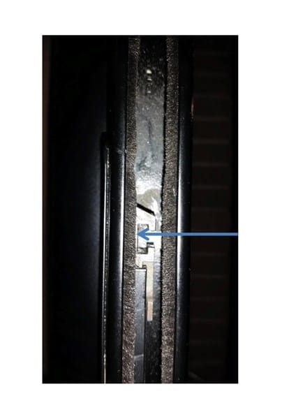 Se me ha caído el tornillo que aparece en la primera foto y que sirve para fijar el gancho de sujeción a la puerta que después encaja con el que hay en la pared y hace que la puerta quede cerrada. El tornillo va donde señalo con la flecha azul.
