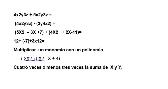 $$\begin{align}&4x^2y^3z+5x^2y^3z = 9x^2y^3z\\&\text{se ha podido sumar porque eran iguales}\\&\text{todos los factores y sus exponentes}\\&\\&\\&\text{los números se multiplican y los exponentes se suman}\\&4x^2y^3z·3y^4z^2=4·3·x^2·y^{3+4}·z^{1+2}=\\&12x^2y^7z^3\\&\\&\\&\text{se suman entre sí términos con el mismo exponente}\\&(5x^2-3x+7)+(4x^2+2x-11)=\\&(5+4)x^2 +(-3+2)x +7-11=\\&9x^2-x-4\\&\\&\\&\text{es sencillísmo}\\&12+(-7)+3x^{12} = 12-7+3x^{12}=5+3x^{12}\\&\\&\text{se multiplica por cada monomio del segundo}\\&(-2x^2)(x^2-x+4) =\\&(-2x^2)(x^2) + (-2x^2)(-x)+(-2x^2)·4=\\&-2x^{2+2}+2x^{2+1}-8x^2=\\&-2x^4+2x^3-8x^2\\&\\&\\&\text{veces significa multiplicar}\\&4·x-3·(x+y) = 4x-3x-3y = x-3y\end{align}$$: