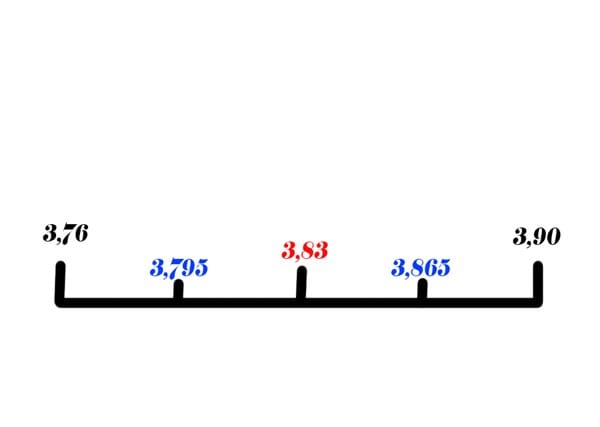 Hallar el numero que se encuentra en la mitad entre 3,76 y 3,90. Si se divide la distancia que hay entre estos números en cuatro partes iguales, ¿cuáles otros números se encontraran entre ellos?