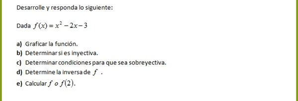 $$\begin{align}&y=x^2-2x-3\\&\\&x^2-2x-3-y=0\\&\\&x=\frac{2\pm \sqrt{4+4(3+y)}}{2}\\&\\&x=1\pm \sqrt{4+y}\\&\\&f^{-1}(x)= 1\pm \sqrt{4+x}\\&\\&\\&\\&e)\\&\\&(f\circ f)(2)=f(f(2))=\\&f(2^2-2·2-3) =f(4-4-3)=\\&f(-3)=(-3)^2-2·(-3)-3=9+6-3=12\\&\\&Resumiendo\\&(f\circ f)(2) = 12\end{align}$$: