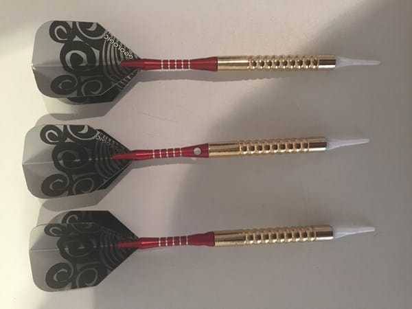 El tema de los dardos, me compré unos sencillos para empezar unos SUNBURST de 18 gr. Ya le he cambiado la caña que le había puesto una de plástico pero ayer cambié a acero (creo que es acero), también he cambiado la cola y la punta. Así que no se ahora mismo cuanto pesan mis dardos, ¿eso cómo puedo saberlo?, estos son los que tengo ahora mismo