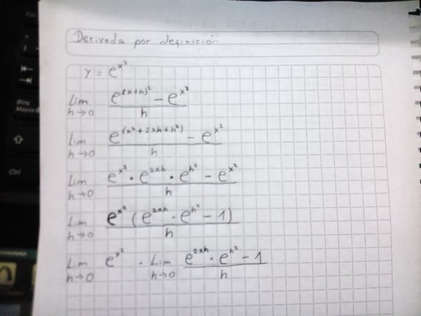 $$\begin{align}&f(x)=e^{x^2}\\&\\&f'(x)=\lim_{h\to 0}\frac{e^{(x+h)^2}-e^{x^2}}{h}=\\&\\&\lim_{h\to 0}\frac{e^{(x^2+2xh+h^2)}-e^{x^2}}{h}=\\&\\&\lim_{h\to 0}\frac{e^{x^2}\left(e^{(2xh+h^2)}-1\right)}{h}=\\&\\&e^{x^2}·\lim_{h\to 0}\frac{e^{(2xh+h^2)}-1}{h}=\end{align}$$A partir de aquí, si usas la fórmula de Taylor tal como te han hecho estas usando derivadas, y si usas la regla de l'Hôpital también, luego hay que usar un método que no use derivadas. Para ello vamos a calcular este límite: