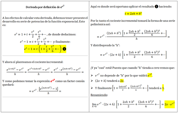 Recuerda, si a ti te han definido la función exponencial definiéndote primero el número e y la función elevar a algo, no puedes usar la serie de potencias de e^x sin antes haber aprendido las derivadas y la serie de Taylor. Pero si resulta que estás calculando la derivada te has adelantado al plan de estudios al usar la serie de potencias.