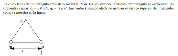 $$\begin{align}&\vec{q_1A}=0.15(cos60º, sen60º)\implies \\&\vec {u_1}=(cos60º,sen60º)\\&\\&\vec{q_2A}=0.15(-cos60º,sen60º)\implies\\&\vec{u_2}=(-cos60º, sen60º)\\&\\&\\&\text{Y el campo será la suma de los dos}\\&\\&\vec E=K·\frac{q_1}{d_1^2}·\vec{u_1}+K·\frac{q_2}{d_2^2}·\vec{u_2}=\\&\\&\text{como }d_1=d_2\\&\\&=\frac{K}{d_1^2}(-9·10^{-6}·\vec{u_1}+8·10^{-6}·\vec{u_2})=\\&\\&\frac{K·10^{-6}}{d_1^2}(-9\vec{u_1}+8·\vec{u_2})=\\&\\&\\&\frac{8.9875·10^9·10^{-6}}{0.15^2}\frac{\frac{N·m^2}{C^2}}{m^2}\left(-9·\frac 12-8·\frac 12,\;-9 \frac {\sqrt{3}}2+8 \frac{\sqrt 3}{2} \right)C=\\&\\&399444.4444\left(-\frac{17}{2},\;-\frac{\sqrt{3}}2 \right) N/C\\&\\&\text{Ese es el vector campo, y su módulo es}\\&\\&|\vec E|=399444.4444 \sqrt{\frac{17^2}{4}+\frac 34}\; N/C=\\&\\&399444.444 \sqrt {73} \;N/C=\\&\\&3412854.826\; N/C\end{align}$$