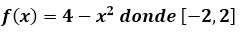 $$\begin{align}&S=\lim_{n\to \infty}\sum_{i=1}^n f(x_i)·\frac{b-a}n=\\&\\&(b-a)·\lim_{n\to \infty}\frac 1n\sum_{i=1}^nf(x_i)\\&\\&\text{donde }x_i=a+\frac{i(b-a)}{n}\\&\\&\text{Entonces la suma de Riemann es}\\&\\&S=(2-(-2))·\lim_{n\to \infty} \frac 1n\sum_{i=1}^n\left(4-\left(-2+\frac{4i}{n}\right)^2\right)=\\&\\&4·\lim_{n\to \infty} \frac 1n\sum_{i=1}^n\left(4-4-\frac{16i}{n}+\frac{16i^2}{n^2} \right)=\\&\\&4·\lim_{n\to \infty} \left(-\left(\frac {16}{n^2}\sum_{i=1}^ni\right)+\left(\frac {16}{n^3}\sum_{i=1}^ni^2\right)\right)=\\&\\&\text{Y hay que usar algunas fórmulas de sumatorios}\\&\\&\sum_{i=1}^ni= \frac{n(1+n)}{2}=\frac{n^2+n}{2}\\&\\&\sum_{i=1}^ni^2=\frac{n(n+1)(2n+1)}{6}= \frac{2n^3+3n^2+n}{6}\\&\\&=64·\lim_{n\to \infty} \left(-\left(\frac{2n^3+3n^2+n}{6n^3}\right)+\left(\frac{n^2+n}{2n^2}\right)\right)=\\&\\&64·\lim_{n\to \infty} \left(-\frac 13-\frac 1{2n}-\frac{1}{6n^2}+\frac 12+\frac 1{2n}\right)=\\&\\&64·\left(-\frac 13+\frac 12 \right)=64·\frac{-2+3}{6}=\frac{32}{3}\end{align}$$