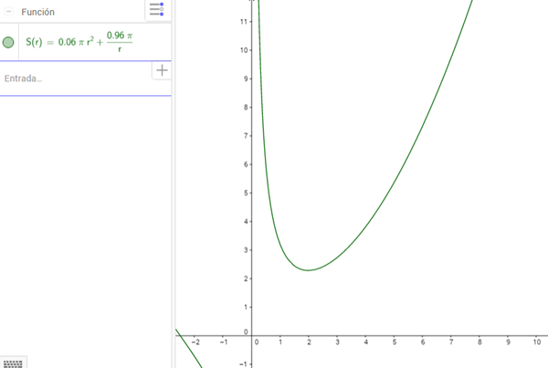 Una lata cilíndrica debe tener un volumen de 24 π pulgadas cúbicas. El costo del material utilizado en las partes superior e inferior es de tres centavos por pulgada cuadrada, y el costo del material utilizado para la parte lateral es de dos centavos por pulgada cuadrada. Expresa el costo de fabricación de la lata como función de su radio y realiza la gráfica de la función obtenida