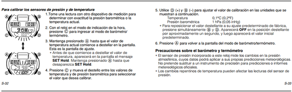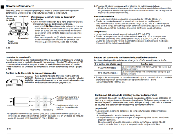 1. Es recomendable y necesario que antes de empezar a usar el barómetro de tu reloj, lo calibres. (Página 4 del PDF-Manual, sección S-32 y S-33)