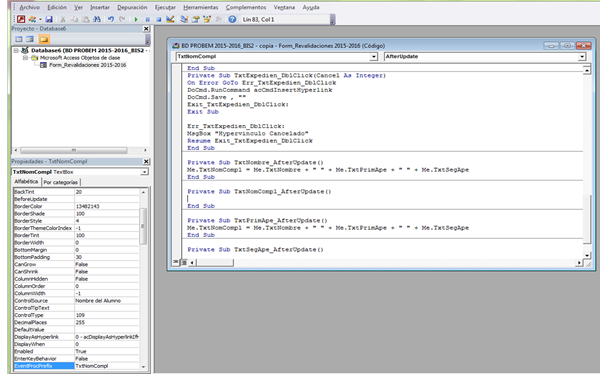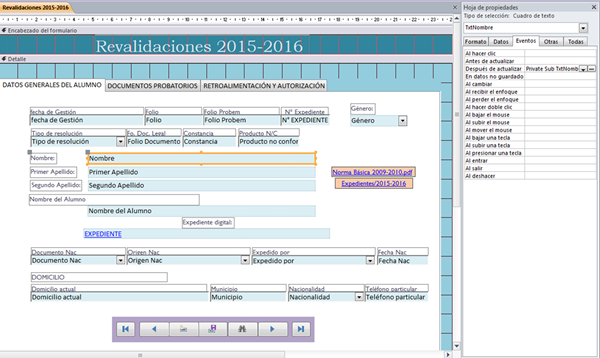 En un textBox(Nombre del alumno, que también es un campo), tengo la siguiente expresión:=[TxtNombre] + [TxtPrimApe]+[TxtSegApe].Esta expresión va en: Propiedades/Datos/Origen del control. Todo está muy bien, el problema es que me aparece en pantalla, pero no se guarda en el campo (Nombre del Alumno)