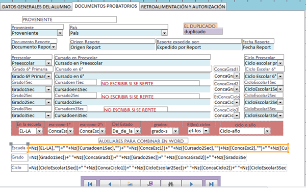 ...IIf(Nz([Cursado en 6°],"") = "", "", " " & [Cursado en 6°])...Entiendo la expresión, la True part, pero la False part???...Si cursado en 6°, está vacío, no pongas "espacio". El "&" concatena textos, ¿si hay espacio...concatena Cursado en 6°? Como ya te habías dado cuenta, soy malísimo para programar, pero me voy a esforzar. Por lo pronto, recibe mi admiración por tu conocimiento y sobretodo por la paciencia con la que me estuvíste apoyando. Por mi parte cierro la consulta.