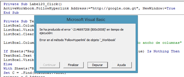 Private Sub Label1_Click() enlace = "http://google.com.gt" On Error GoTo Nocando ActiveWorkbook.FollowHyperlink Address:=enlace, NewWindow:=True Unload Me Exit Sub Nocando: MsgBox "No se puede abrir " & enlace & " Verifique su Fuente de Internet", vbCritical, "Error de Conexion" End Sub