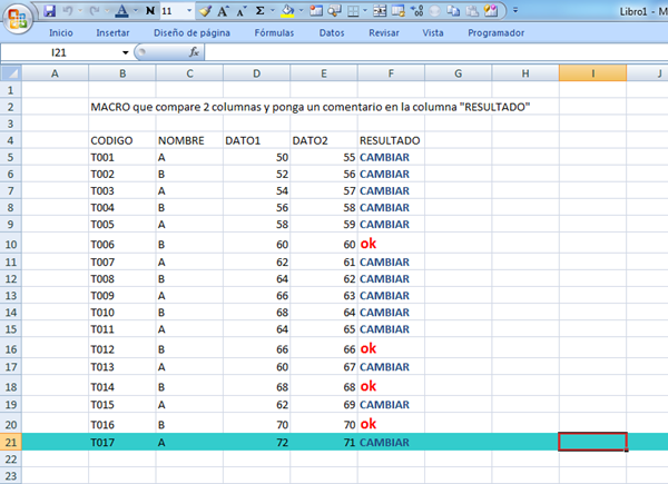 Dante Amor, he tratado de hacer una MACRO CON EVENTO de tal manera que al recorrer las celdas de la columna "CODIGO" (col. "B"), la MACRO compare la celdas de la columna "DATOS1" con los datos de la columna "DATOS2", y si son iguales, se escriba "ok" (en letra roja, negrita y tamaño 14), y si son diferentes se escriba "CAMBIAR" (en letra azul, negrita y tamaño 14) estas palabras van en la columna "RESULTADO". Como se muestra en la figura