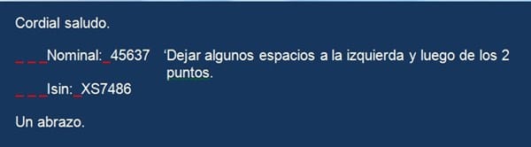 Hola Dante. Tengo las correcciones que me habías sugerido. Ahora quiero que en el cuerpo del correo me deje algunos espacios a la izquierda del texto que va más abajo del saludo y un espacio luego de los dos puntos de cada subtítulo.