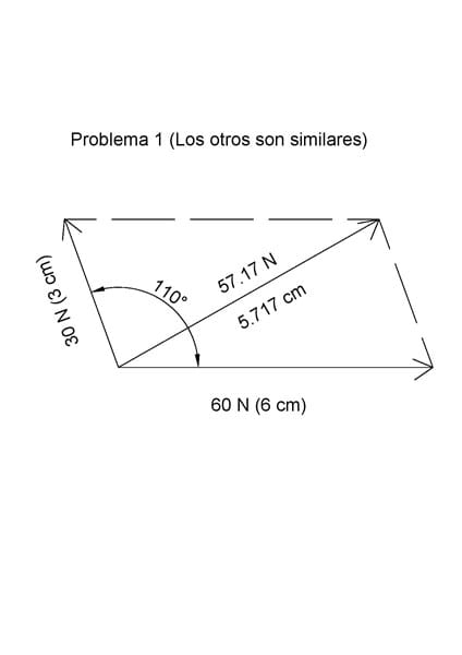 1. Un cable se ata alrededor de un poste telefónico. La fuerza del cable de la derecha es de 60 newtons y la fuerza del cable de la izquierda es de 30 newtons si los cables forman un angulo de 110 grados ¿cual es la fuerza resultante sobre el poste telefónico (utiliza una escala de 1 cm=10 newtons).