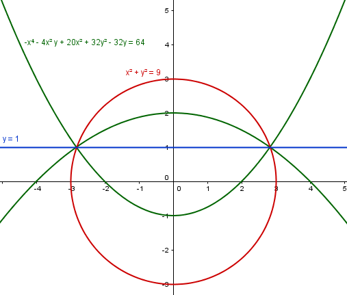$$\begin{align}&\text{Sea la circunferencia con ecuación}\\&\\&(x-h)^2+(y-k)^2=r^2\\&\\&\text{sabemos que C(h,k) es el centro}\\&\\&d(C,recta) = \frac{|k-1|}{\sqrt{0^2+1^2}}=|k-1|=r\\&\\&\text{Luego la ecuación de la circunferencia queda}\\&\\&(x-h)^2+(y-k)^2=|k-1|^2\\&\\&x^2-2hx+h^2+y^2-2ky+k^2= k^2-2k+1\\&\\&x^2+y^2 -2hx -2ky +h^2+2k-1=0\\&\\&\text{Y la intersección de esta circunferencia con }\\&\\&x^2+y^2=9\\&\\&\text{debe ser un punto único.}\\&\\&\text{Sustituyendo esta en la anterior}\\&\\&9 - 2hx \pm 2k \sqrt{9-x^2} +h^2+2k-1=0\\&\\&\pm2k \sqrt{9-x^2}=-8+2hx-h^2-2k\\&\\&4k^2(9-x^2) = 4h^2x^2 -2(2hx)(8+h^2+2k)+(8+h^2+2k)^2\\&\\&4(h^2+k^2)x^2-4h(8+h^2+2k)x+(8+h^2+2k)^2-36k^2=0\\&\\&\text{Para que haya solucion única el discriminante debe ser 0}\\&\\&16h^2(8+h^2+2k)^2-16(h^2+k^2)[(8+h^2+2k)^2-36k^2]=0\\&\\&16·36h^2k^2-16k^2[(8+h^2+2k)^2-36k^2]=0\\&\\&16·36k^2(h^2+k^2) - 16k^2(8+h^2+2k)^2=0\\&\\&36(h^2+k^2)-(8+h^2+2k)^2=0\\&\\&\end{align}$$Y como esto ha sido algo complicado haré la gráfica para asegurarme de que es posible que sea esa la respuesta.