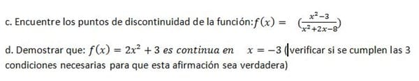 $$\begin{align}&x=\frac{-2\pm \sqrt{4+32}}{2}=\frac{-2\pm6}{2}=-4\;y\;2\end{align}$$Luego la función es continua en R -{-4, 2}