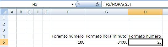 Me gustaría me ayudaran, tengo una celda con formato de hora, por ejemplo 4:00 hora y la quiero dividir entre otra celda con numero por ejemplo 100, y soy incapaz sacar el resultado en numero "25"