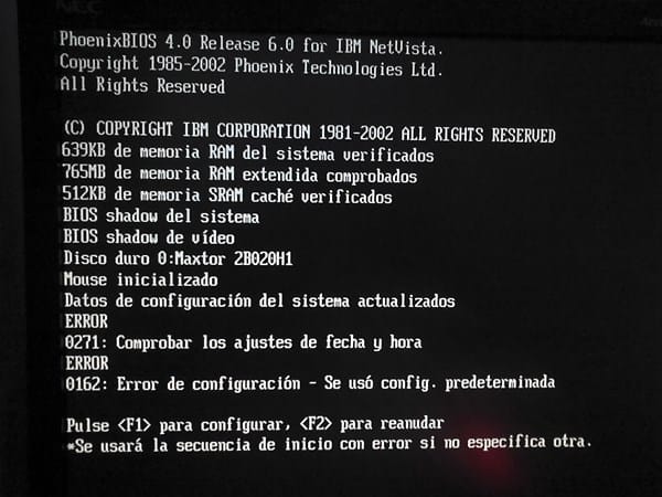 Ésta ultima siempre aparece cuando después de que aparece el logo de ibm, aparece esta información y bueno, tengo que presionar F1 para modificar la fecha, sobre el error del 0162, no sé a que se refiera, solo modifico la fecha, guardo cambios e inicia el SO XP con el usuario de administrador pidiendo la clave