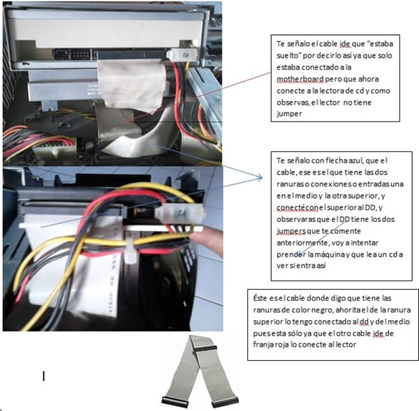 Te envío unas imágenes, te comento que el lector no cuenta con jumper y ya le puse el cable IDE con franja roja (yo la veía rosa), y el DD con el otro cable que tiene las ranuras o entradas de color negro, pero las imágenes hablaran mejor: