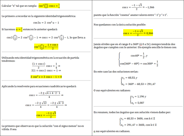 $$\begin{align}&\cos^2x =\frac{1+\cos 2x}{2}\\&\\&\text{Cambiando x por x/2 queda esta}\\&\\&\cos^2 \frac x2 = \frac{1+\cos x}{2}\\&\\&\text{Y con esto vamos a la ecuación}\\&\\&\frac{1+\cos x}{2}·cosx = \frac 14\\&\\&\frac{cosx +\cos^2x}2 = \frac 14\\&\\&4cos^2x+4cosx =2\\&\\&2cos^2x +2cosx -1=0\\&\\&\cos x= \frac{-2 \pm \sqrt{4+8}}{4}=\frac{-1\pm \sqrt{3}}{2}\end{align}$$En principio esos son unos cosenos que no conocemos, o los dejamos expresados sin operar o los operamos para ver por donde caen