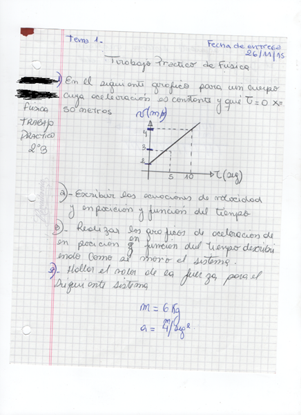 $$\begin{align}&t=0 -> v = 2m/s\\&t=10s -> v = 4m/s\\&\text{Conocemos la expresión general de la recta, que es:}\\&\frac{y-y_0}{y_1-y_0}=\frac{x-x_0}{x_1-x_0}\\&Reemplazando, \ los \ datos\ conocidos\\&\frac{y-2}{4-2}=\frac{x-0}{10-0}\\&\frac{y-2}{2}=\frac{x}{10}\\&y = \frac{x}{5}+2\\&\text{En realidad, y es la velocidad, x el tiempo, así que la expresión correcta sería:}\\&v(t) = \frac{1}{5}t+2\\&\text{Separé t de la fracción para hacer notar que}\\&a = \frac{1}{5} m/s^2\\&v_0=2 m/s\\&\text{La expresión general de la posición es:}\\&x(t) = x_0 + v_0 t + 1/2 a t^2\\&Reemplazando...\\&x(t) = 50m + 2 m/s \cdot t + 1/2 \cdot 1/5 m/s^2 \cdot t^2\\&x(t) = 50m + 2 m/s \cdot t + \frac{1}{10} m/s^2 \cdot t^2\end{align}$$El gráfico para la aceleración es una recta horizontal (pues es constante) en el punto 1/5 del eje "y"