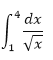 $$\begin{align}&\text{Como medio inmediata imagino que sabrás}\\&\\&(\sqrt x)' = \frac{1}{2 \sqrt x}\\&\\&entonces\\&\\&\int \frac {dx}{\sqrt x}=\\&\\&\text{divido dentro por 2 y fuera multiplico por 2}\\&\\&2·\int \frac{dx}{2 \sqrt x}= 2 \sqrt x\\&\\&\text{Y usando lenguaje exponencial es}\\&\\&\int \frac{dx}{\sqrt x}=\int x^{-\frac 12} dx = \frac{x^{-\frac 12+1}}{-\frac 12+1}=\frac {x^{\frac 12}}{\frac 12}=2x^{\frac 12}=2 \sqrt x\\&\\&\text{Y una vez conocida la indefinida calculamos la definida}\\&\\&\int_1^4 \frac{dx}{\sqrt x}= 2 \sqrt x\bigg|_1^4= 2(\sqrt 4-\sqrt 1)= 2(2-1)=2·1=2\end{align}$$: