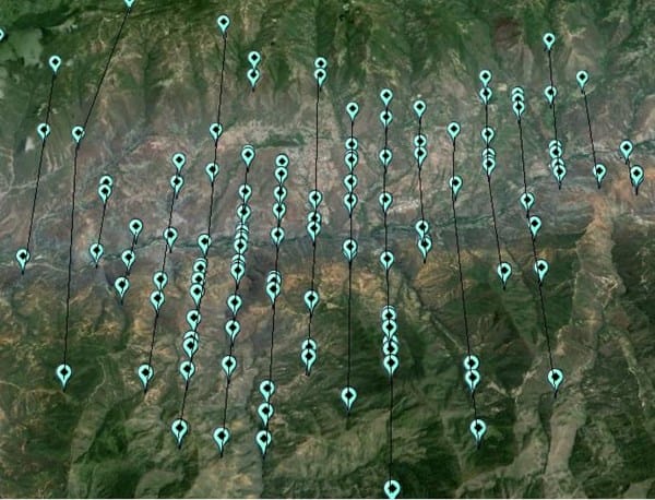 Distribución de epicentros sísmicos en líneas paralelas equidistantes